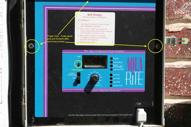 We’ve been fighting this all summer and, one morning I went out to visit the outside Aqua Rite controller and found that the green “generating” light was not lit. In fact, there was only one light on…I think it was the power light and, if I remember correctly, it was red instead of green. I may be wrong on this, but I do remember there was just one light on and I said, “Dang, now I know why we’ve been fighting having enough chlorine in the pool all summer!” Yeah, the thing’s been busted all summer long. Probably happened in the spring during one of our thunderstorms.