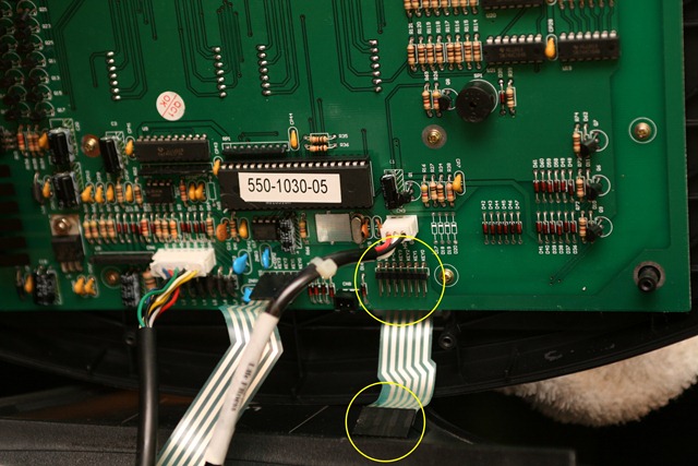 I’ve been working on this over the weekend and have come to the conclusion that there is a problem with the membrane switch part of the console. If I disconnect the keypad connector on the back of the console (the 7-pin flat connector in the picture) then the erratic behavior goes away. As soon as this is reconnected, the console goes into crazy mode. It’s really a shame because I’m pretty sure you can’t purchase the front part of the console with the switches. I’m going to be shelling out $350 to get my console repaired.