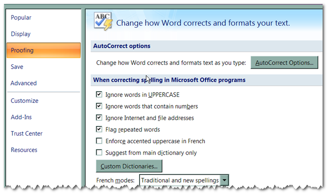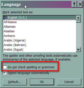 Nope! What are you, CRAZY? Finally I found this post about Word 2003 that led me to looking at some of the mystery meat tool ribbon navigation. Since we don’t have a Tools menu, I hovered my mouse around until I found the language options. That’s convenient…no text, just an easily interpreted icon. A white thing with a red check mark with a green globe thing in the background. How could I have missed that? That says "language options" to me! Talk to me!