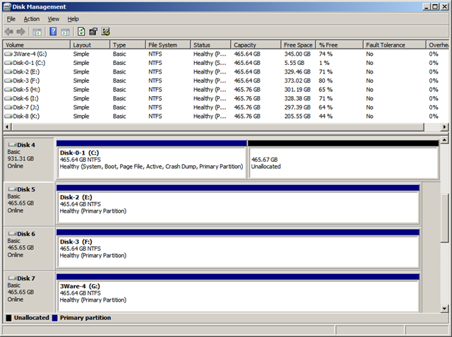 I pulled out the manual and did some reading and read about OCE (Online Capacity Expansion) and RAID level migration, but I didn’t see the answer there. I tried using the 3Ware knowledge base, but no luck. Searching the web, I didn’t find too much detail on the subject. I found some blog posts where folks were talking about doing this (lots of Linux posts), but nothing with a definitive answer to my question. I read where someone suggested hanging another set of drives off another controller and blah, blah, blah. Yeah, like I have lots of $400 controllers lying around. I even read a blog post where someone asked "why" you would do this (?) and you couldn’t do it without basically starting from scratch. Finally I ran across a post where someone suggested to "call 3Ware support." That sounded like a reasonable move.