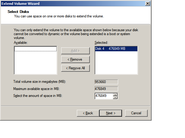 Right-clicking on the new C: drive and selecting Extend began the Extend Volume Wizard. I want it all!