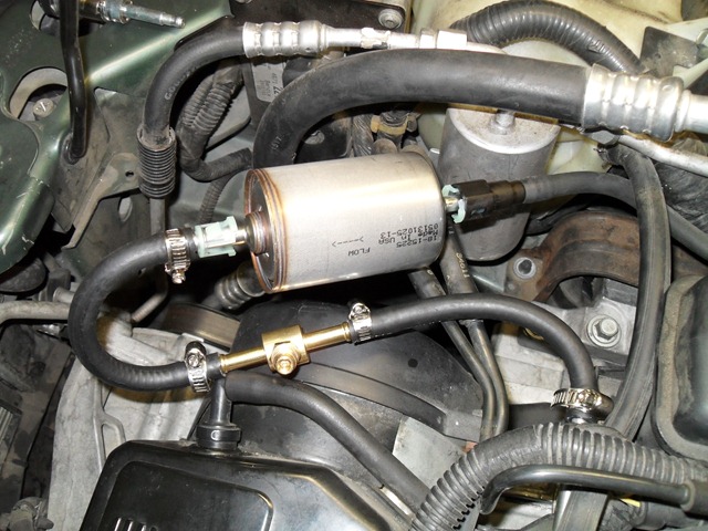 I purchased an FF677 (G6340) fuel filter for about $10 which had the correct fitting for the clip-on part. I used the “universal” tee fitting that came with the tester and connected everything together as shown. Then, I connected it to the fuel line and rail.