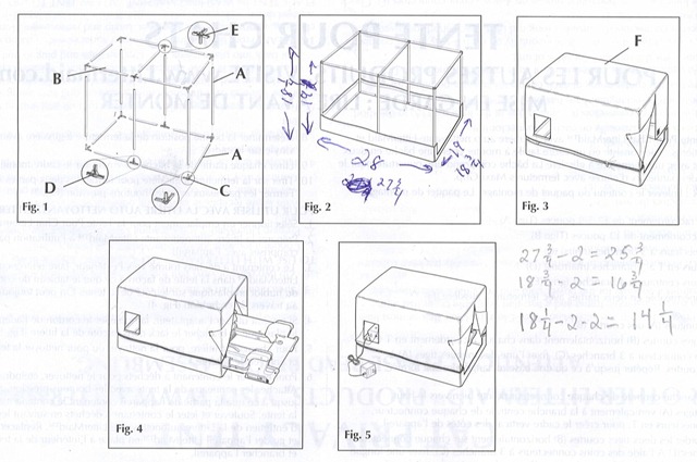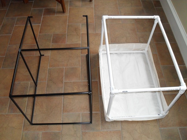 The original frame size is about 28” x 19” x 19”. The new design uses 1/2” schedule 40 PVC and is resized as 27-3/4” L x 18-3/4” W x 18-1/4” H. You can see my notations on the original instructions. A typical PVC connector has a 3/4” receptacle and increases the overall length by 1” when the pipe is buried into the receptacle its full 3/4” depth. Since I couldn’t find 3-way connectors with all slip connections, I had to use 3-way connectors with 2 slip and 1 threaded connection. This meant that I used adapters for the vertical sections, which took another 1” (x 2) off the length pipe needed. That’s where the 18-1/4” – 2 – 2 = 14-1/4” calculation comes from (subtracting 2” from each side to allow for the connectors).