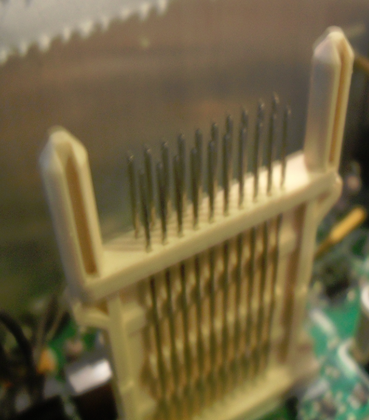 Fuzzy photo showing the connector pins on the back of the circuit board.