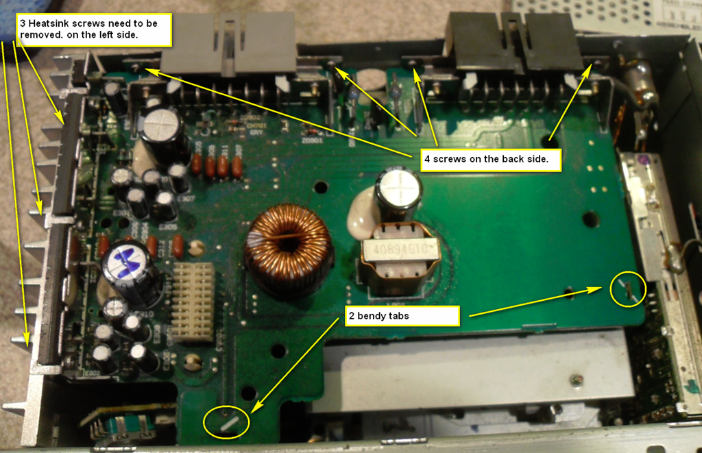 Remove three screws on the heatsink side and four screws from the back side. Un-bend the tabs. Now you can start carefully prying the board out. Take your time!