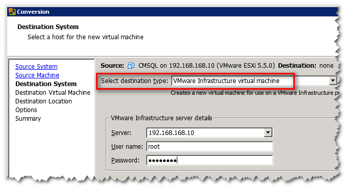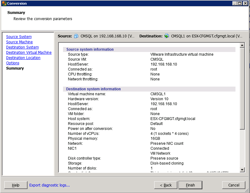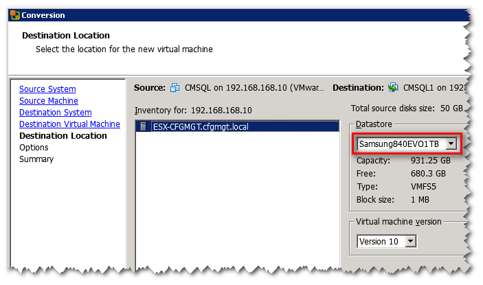 So my goal was to move my SQL VM first. There are many ways documented to do this, such as using the manual vmkfstools method, as documented in this thread by telecastle. However, in my experience I’ve found it’s much easier to use VMWare vCenter Converter Standalone to move VMs around.