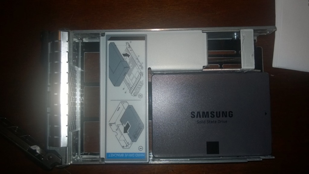 To make this work you can use a standard drive tray (purchased from eBay for $11.79) and a 3.5-to-2.5 SATA adapter (also purchased from eBay for $9.99). In this case, I installed a Samsung 840 EVO 1TB SSD that I also acquired from eBay ($445.00).