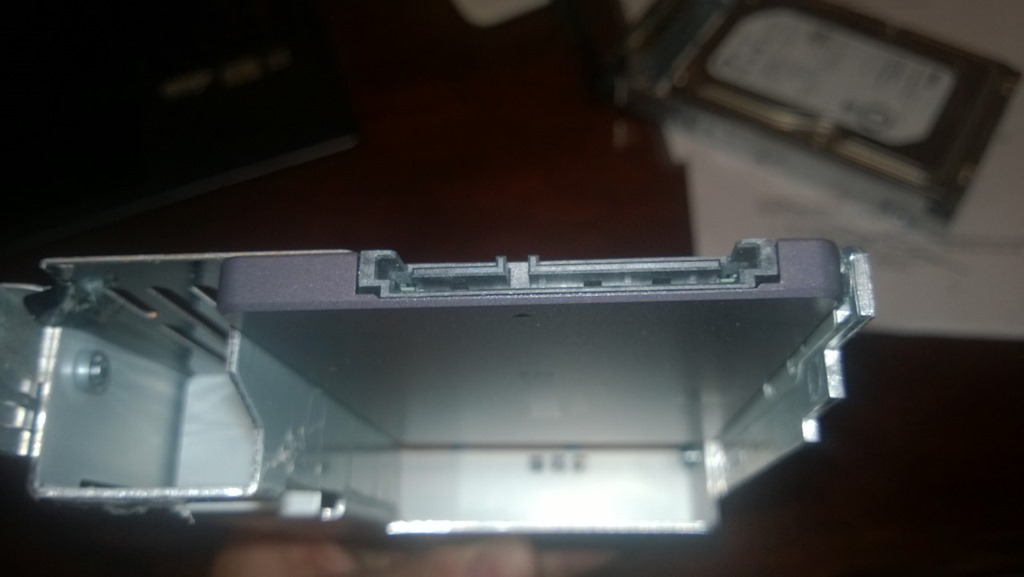 You can see I failed to peel off all the plastic protective coating on the adapter, but hopefully that won’t be a big deal. Just be sure to install the two screws on the adapter and the SSD prior to installing the adapter in the drive tray!