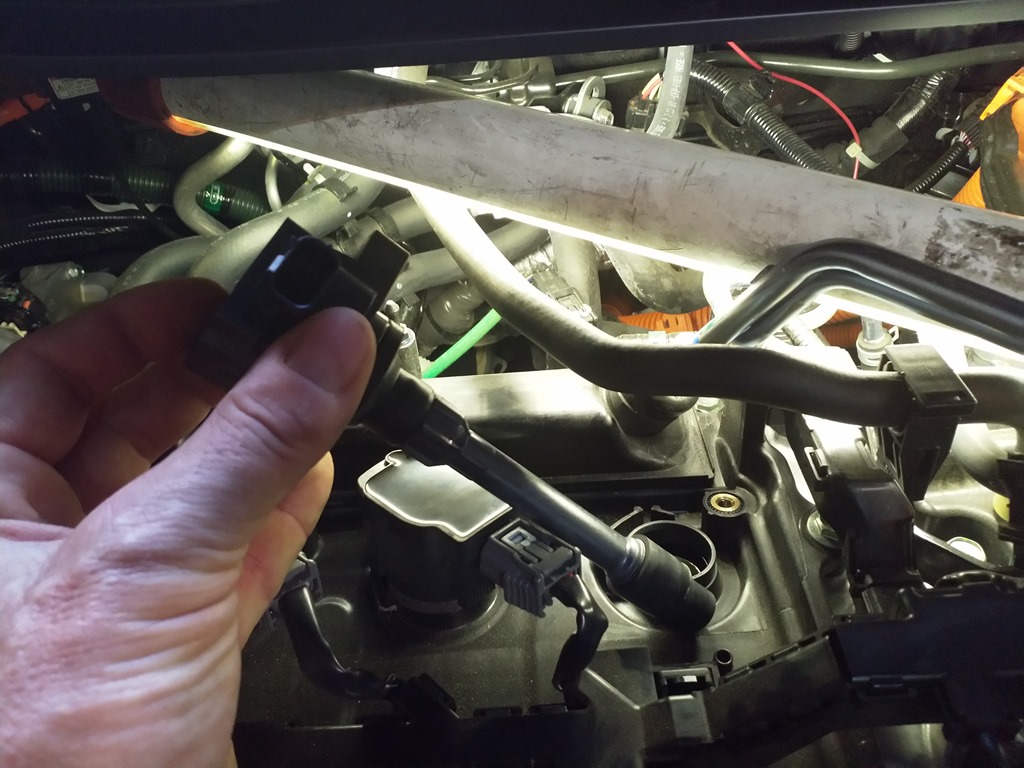 The easiest way to do this is to remove the coil. Start by pressing the tab on the connector near my thumb end and gently pull on the sides to disconnect.