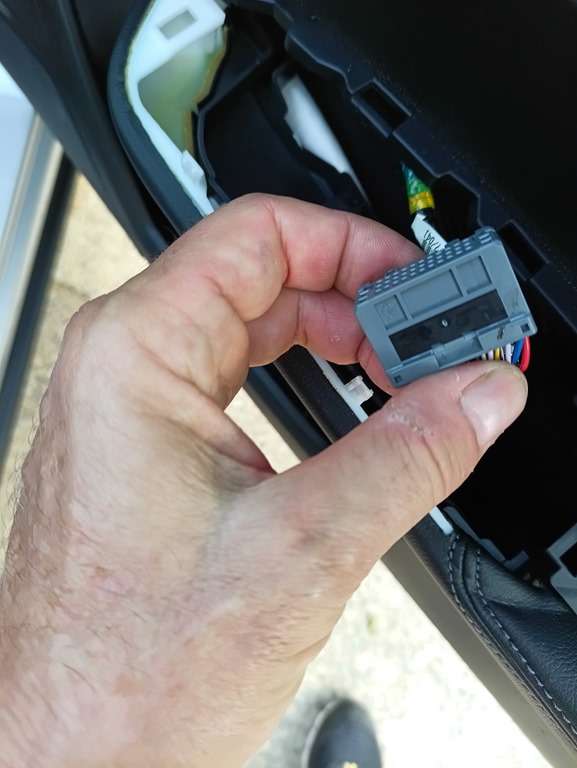 There is a connector clip that needs to be released that holds the cable inside the door. The big connector fits through the hole without issue.